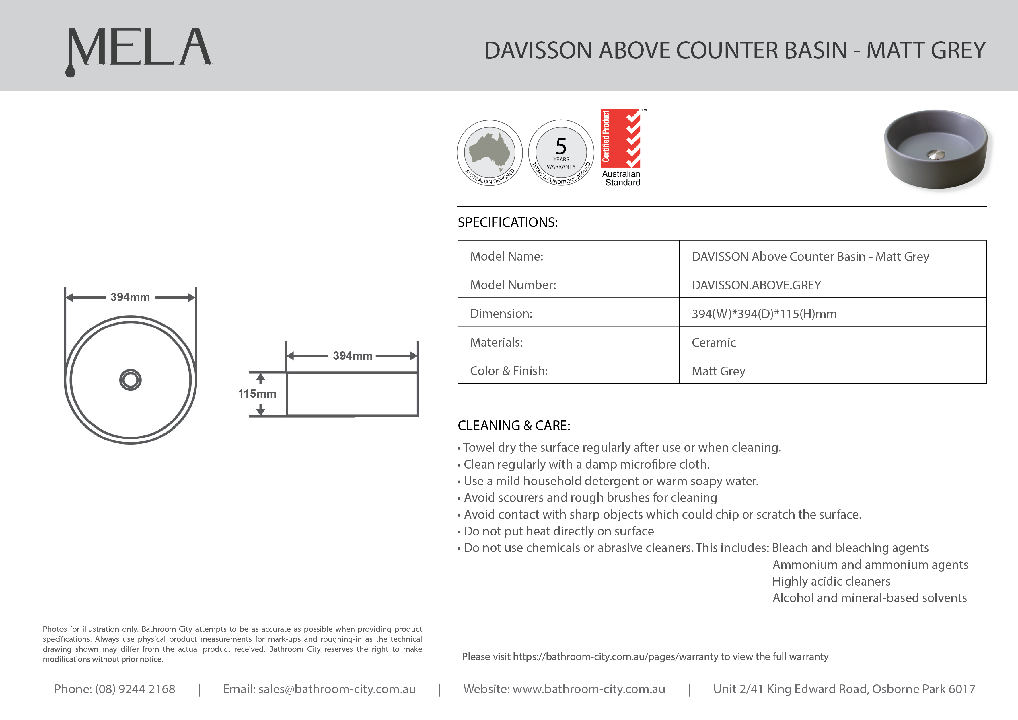 MELA - DAVISSON Matt Grey Above Counter Basin