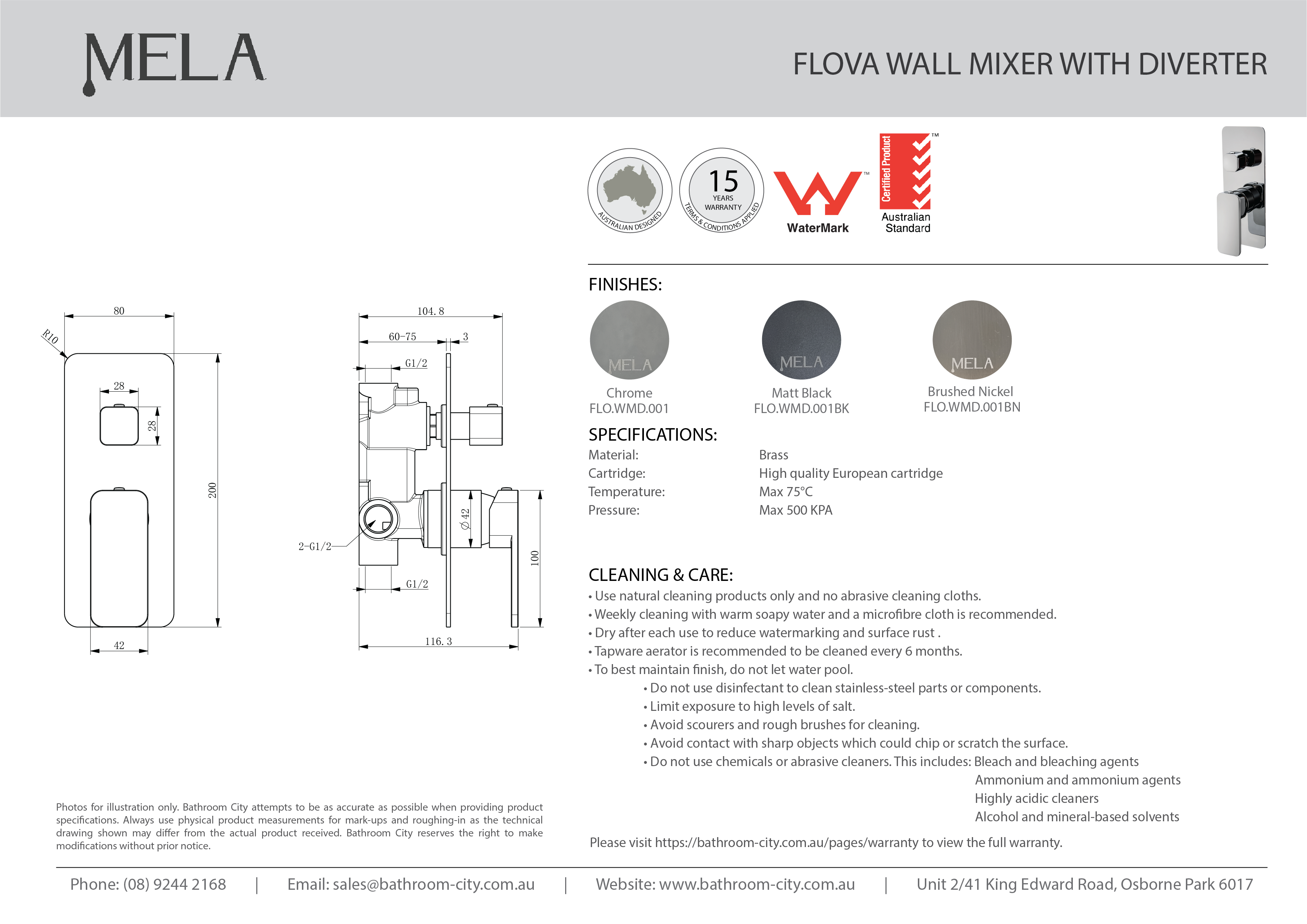 | Model Name | MELA- FLOVA Shower/Bath Wall Mixer with Diverter Chrome |