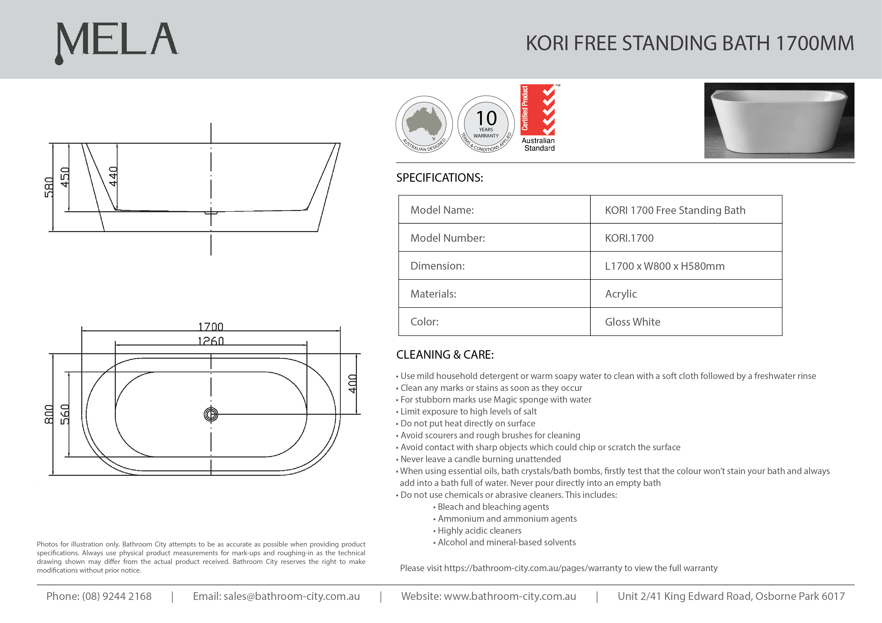 | Model Name | MELA- KORI 1700 Freestanding Bath |