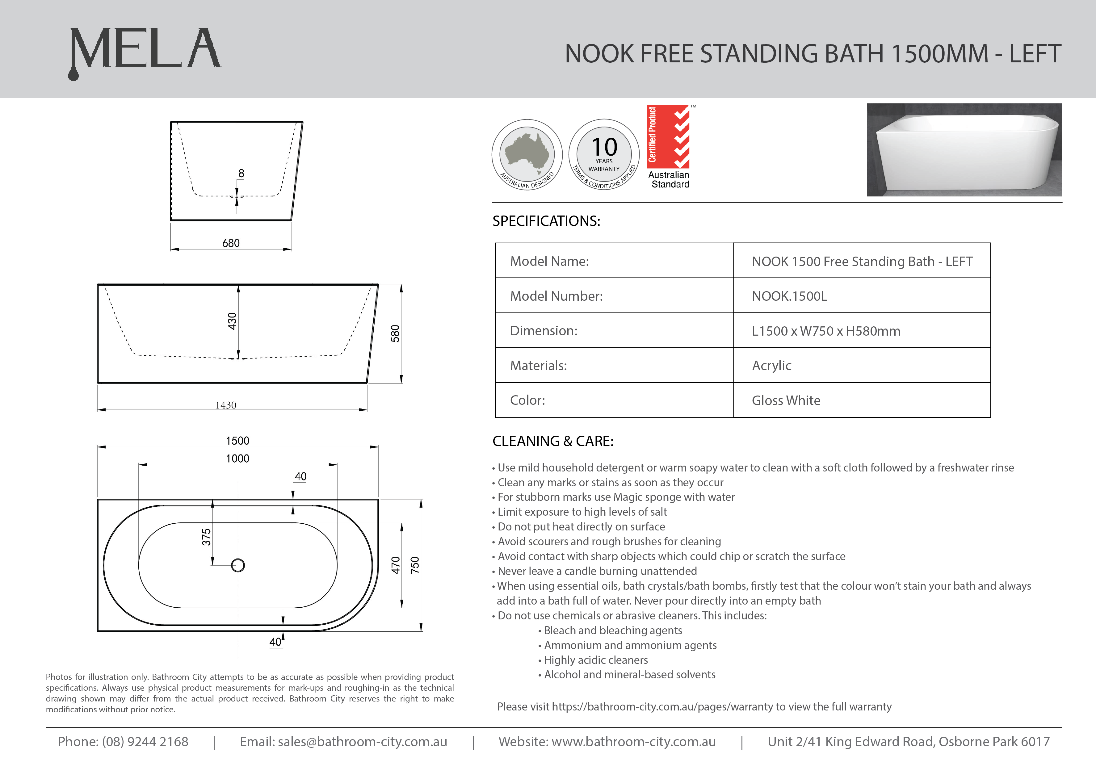 Model Name MELA- NOOK 1500 Freestanding Bath Left Corner