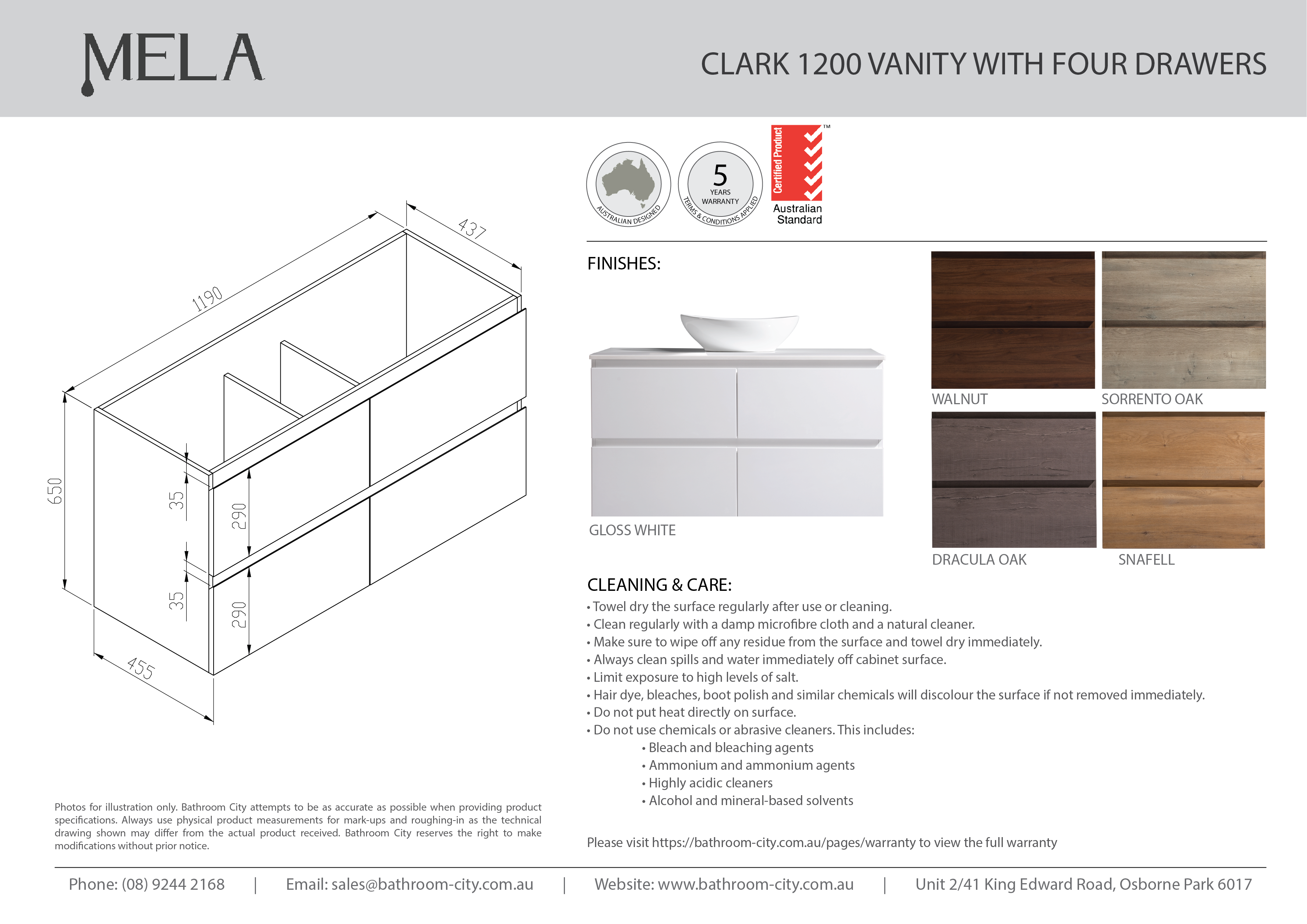 MELA - CLARK 1200 Sorrento Oak Wall Hung Vanity with 4 Drawers Package includes the following: