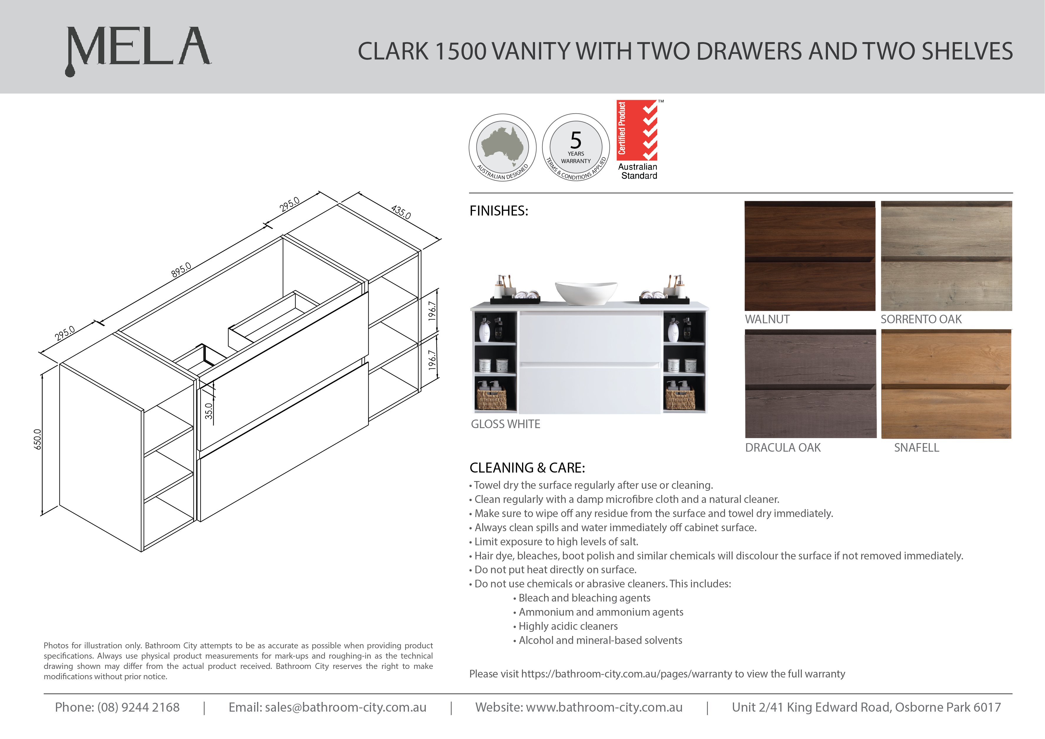 MELA - CLARK 1500 Sorrento Oak Wall Hung Vanity with 2 Drawers and 2 Open Shelves Package includes the following: