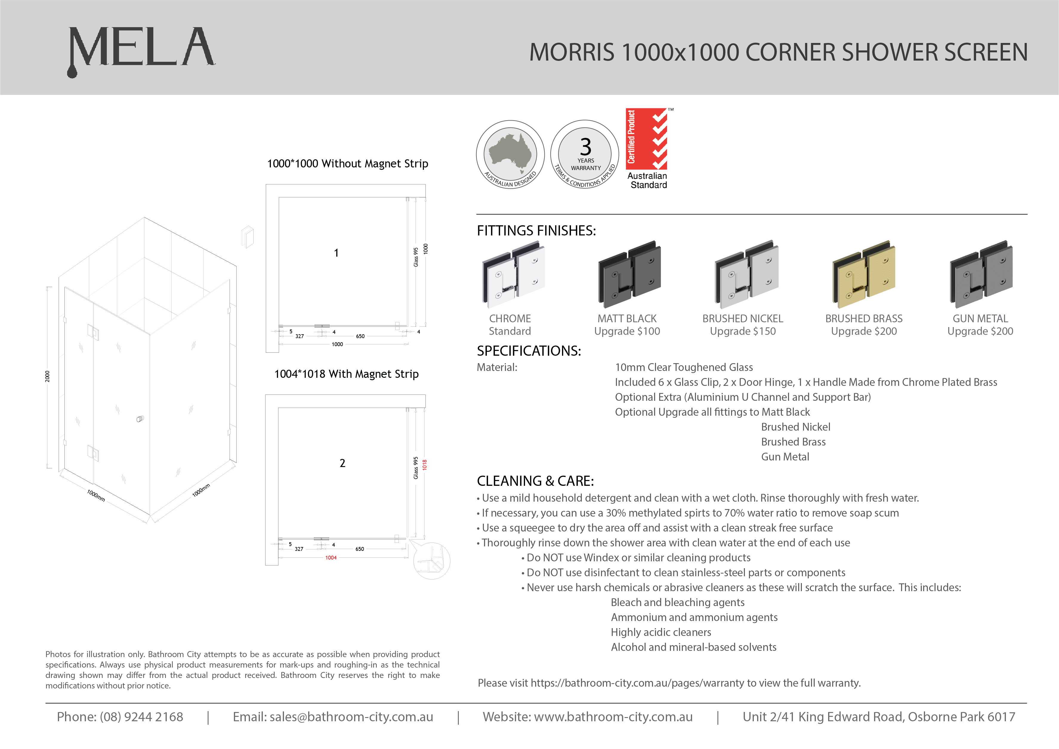Model Name MELA- MORRIS 1000*1000mm Frameless Corner Shower Screen