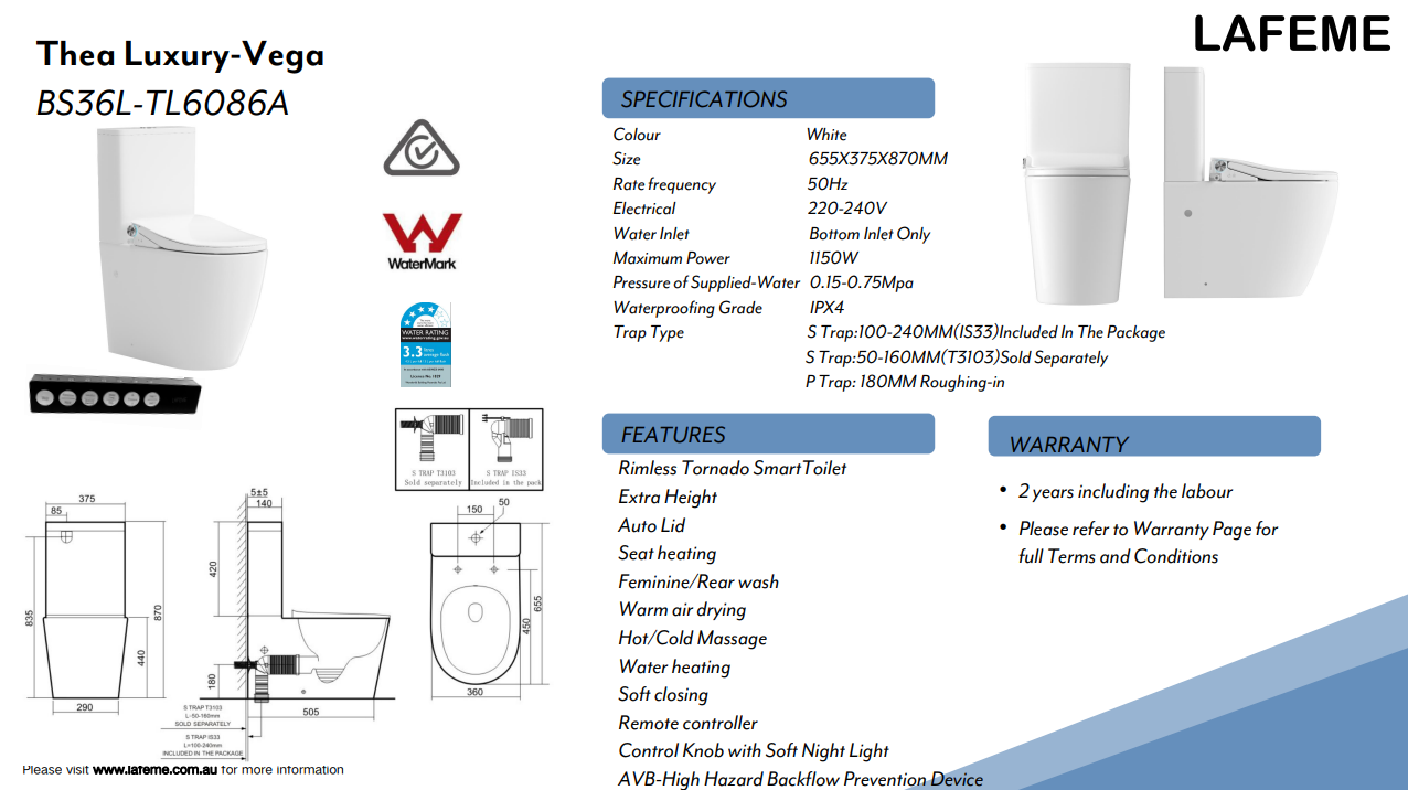 The Lafeme Thea Luxury Vega smart toilet features extra height with a tornado silent flush system, a combination of the Thea Luxury bidet seat and the Vega toilet. Featuring automatic opening, washing mode and heated seat, Thea Luxury Vega delivers control and comfort.