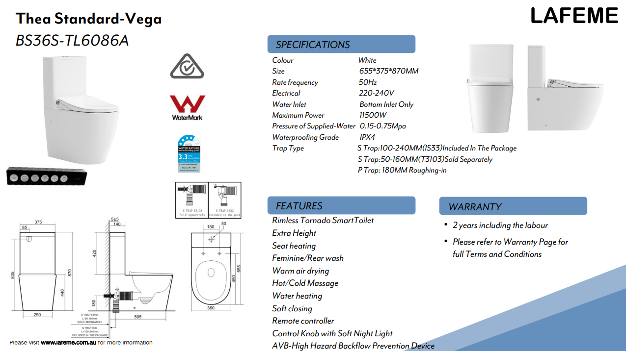 The Lafeme Thea Standard Vega smart toilet features extra height with a silent tornado flush system, a combination of the Thea Standard bidet seat and the Vega toilet. Featuring washing mode and heated seat, Thea Standard Vega delivers control and comfort.