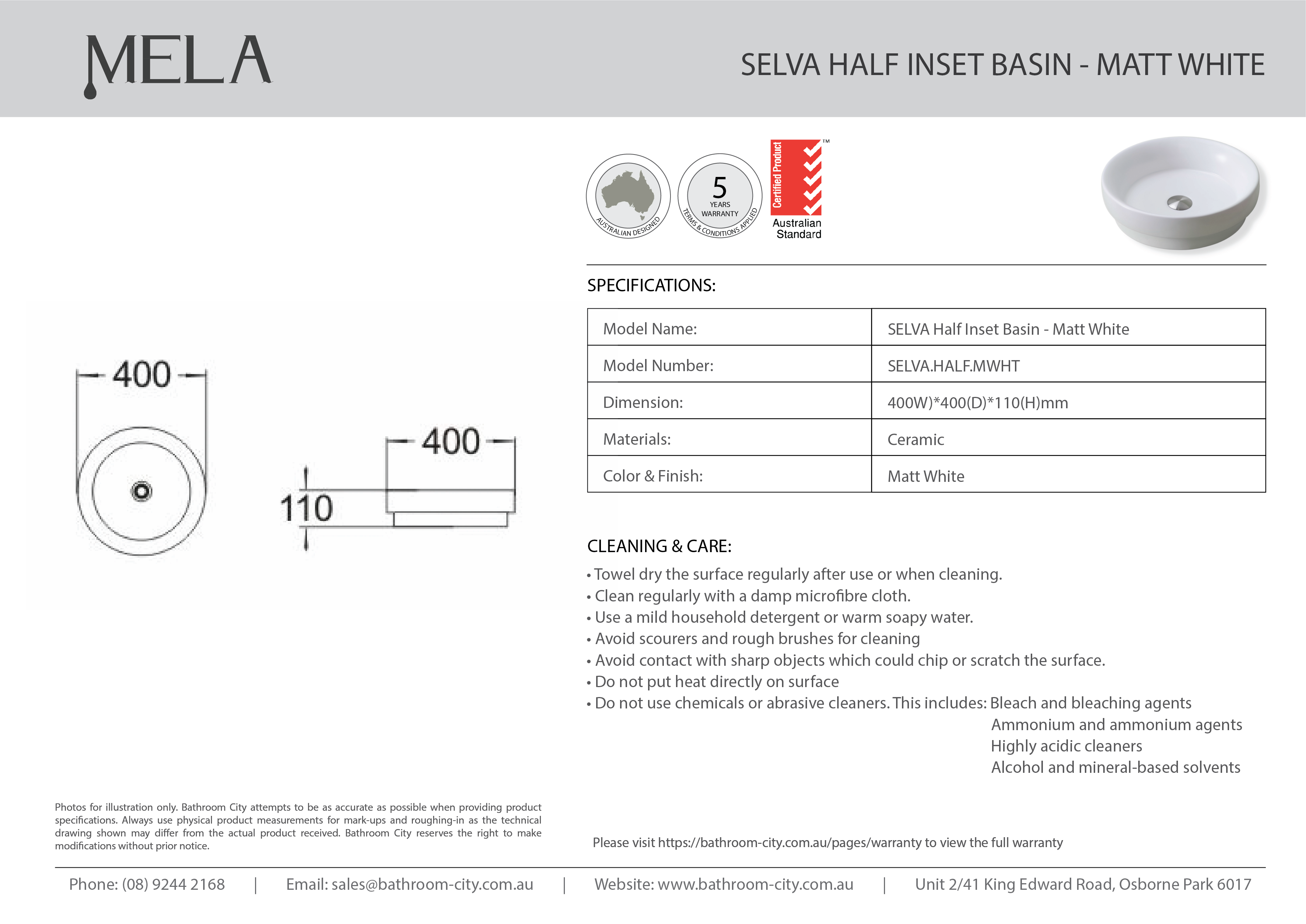 MELA- SELVA Matt White Half Inset Basin |