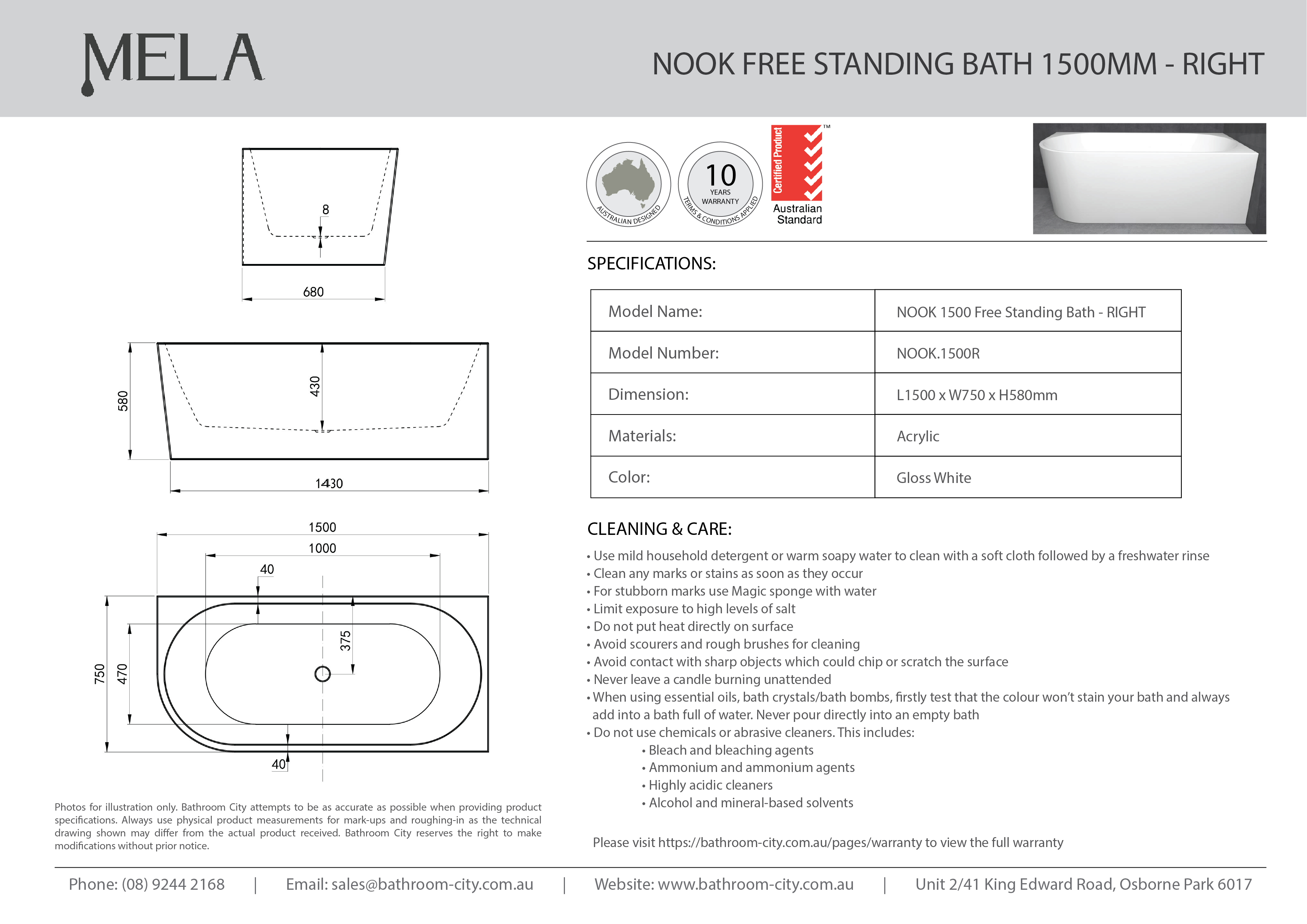 | Model Name | MELA- NOOK 1500 Freestanding Bath Right Corner |