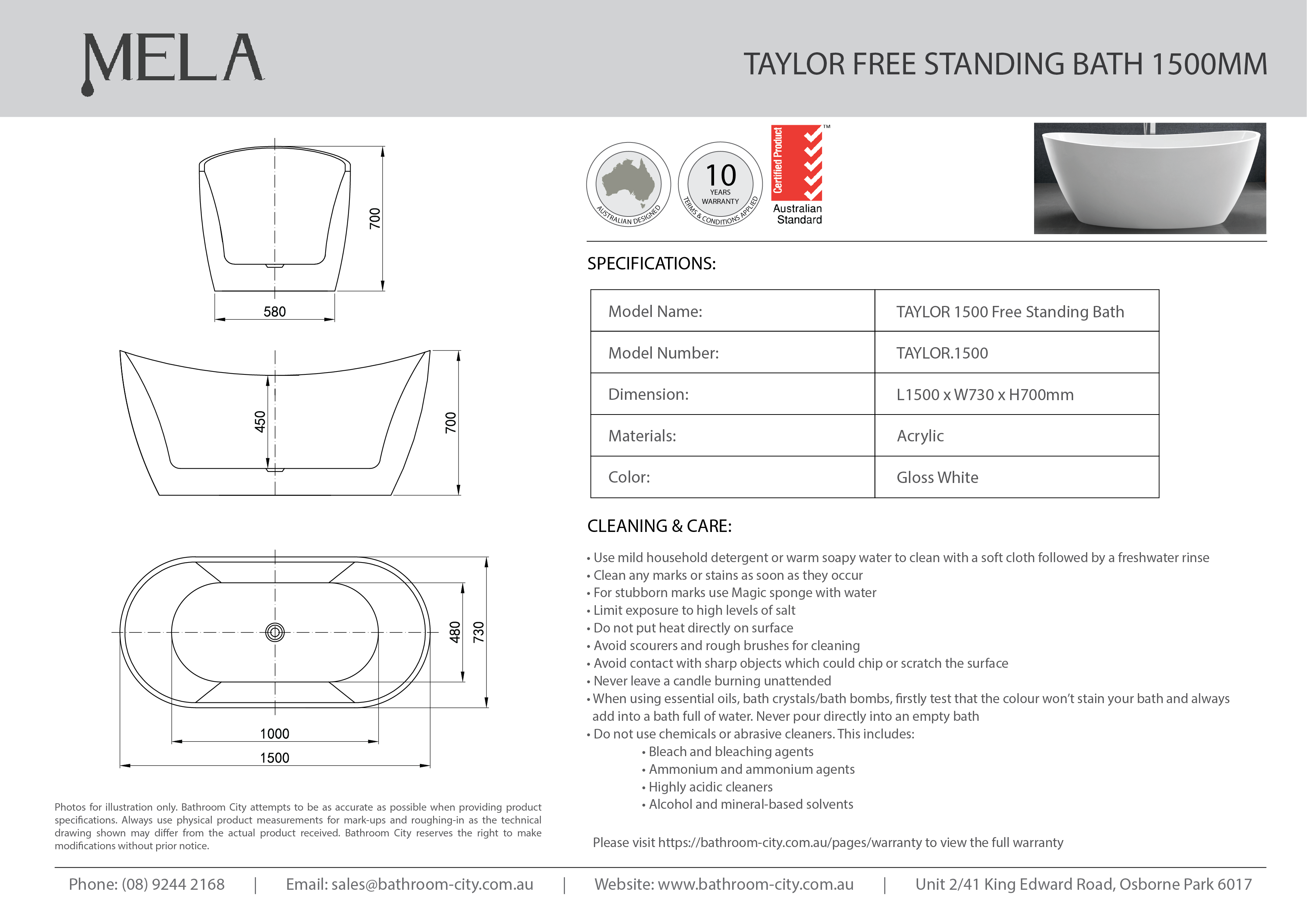 Model Name MELA- TAYLOR 1500 High Back Freestanding Bath