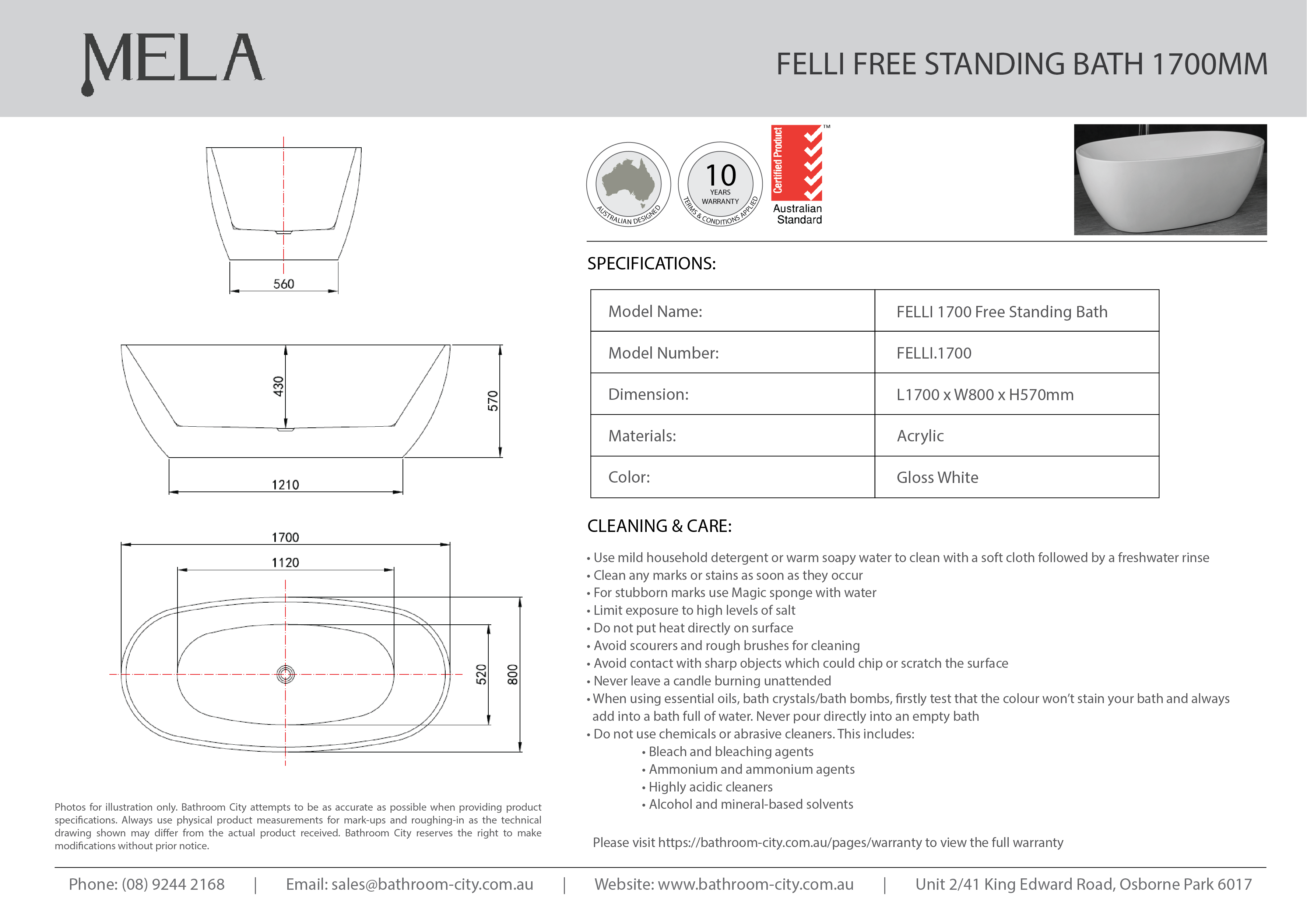 | Model Name | MELA- FELLI 1700 Freestanding Bath |