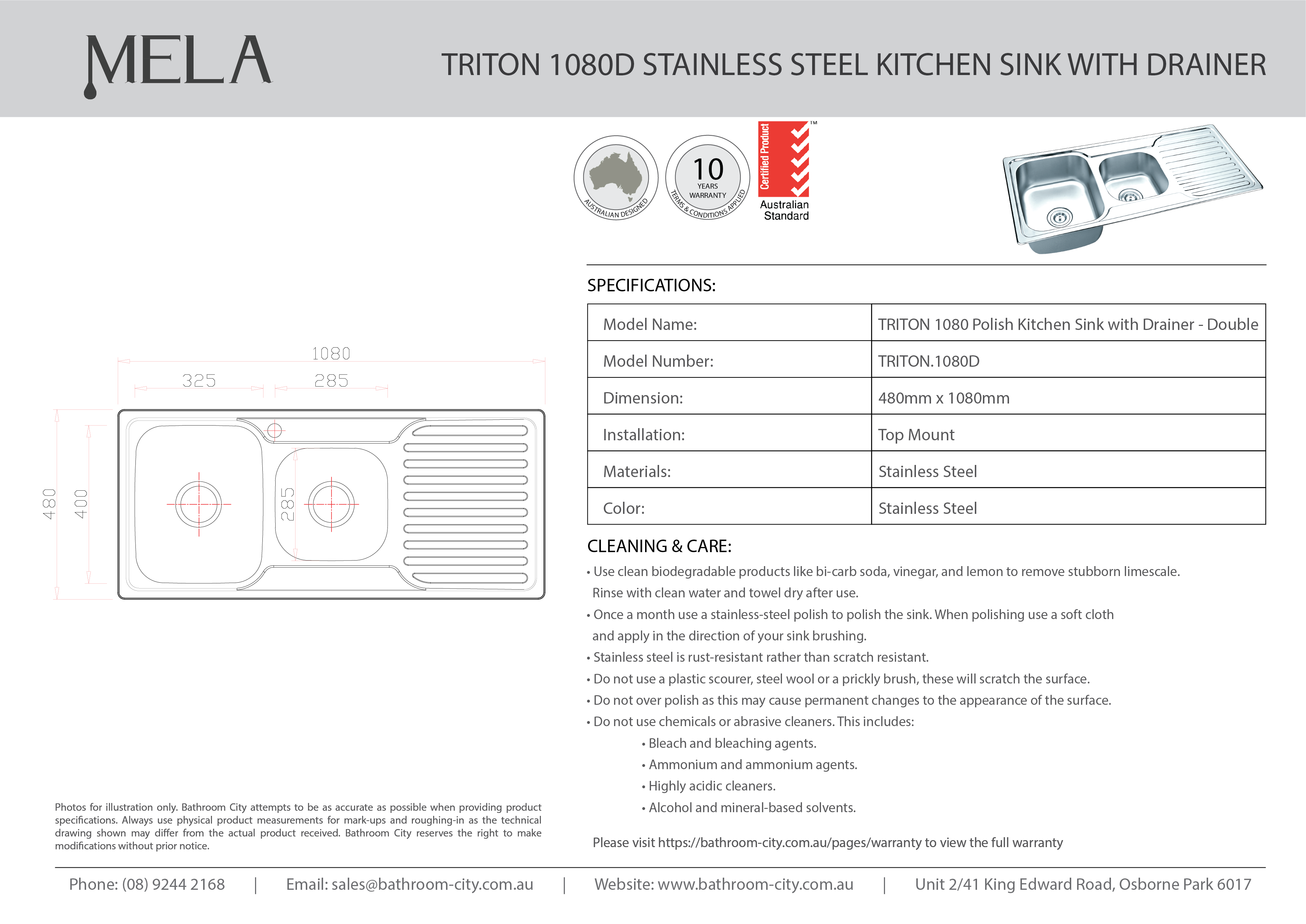 MELA - TRITON 1080 Polish Stainless Steel Sink with Drainer