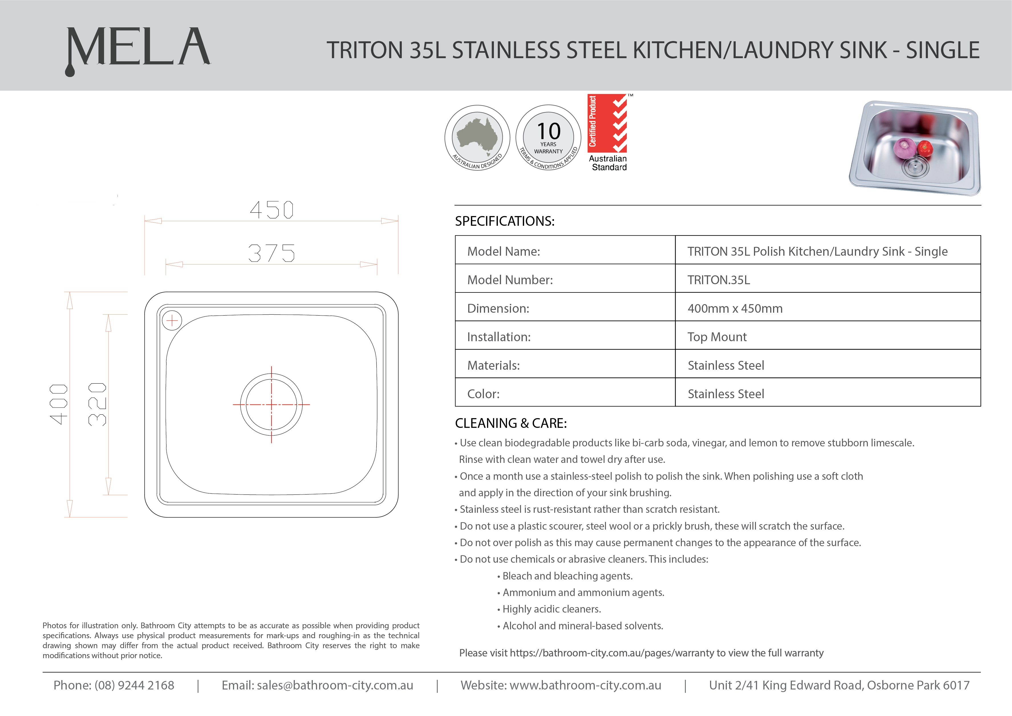 MELA - TRITON 35L Polish Stainless Steel Sink