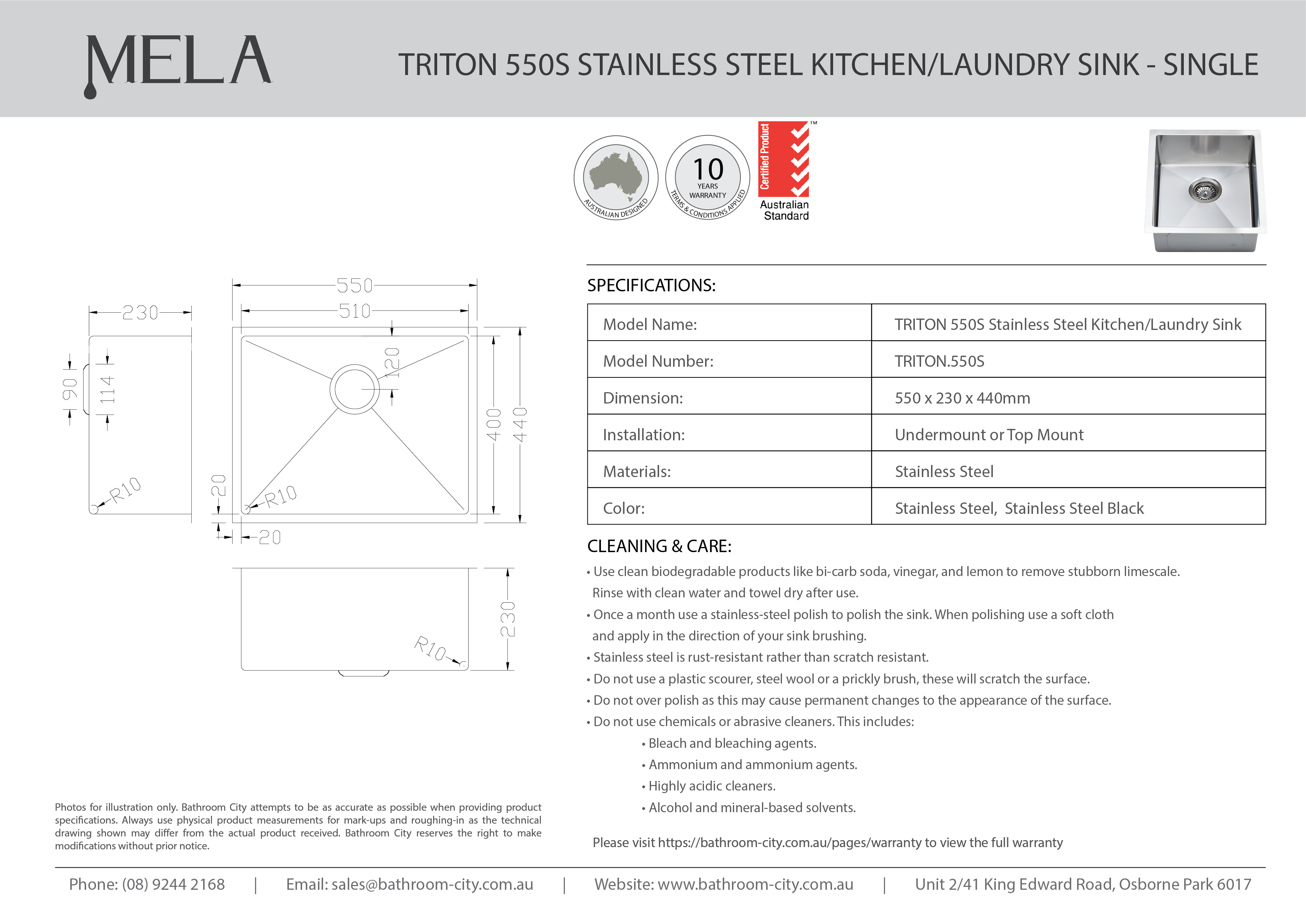 MELA - TRITON 550S Stainless Steel Sink