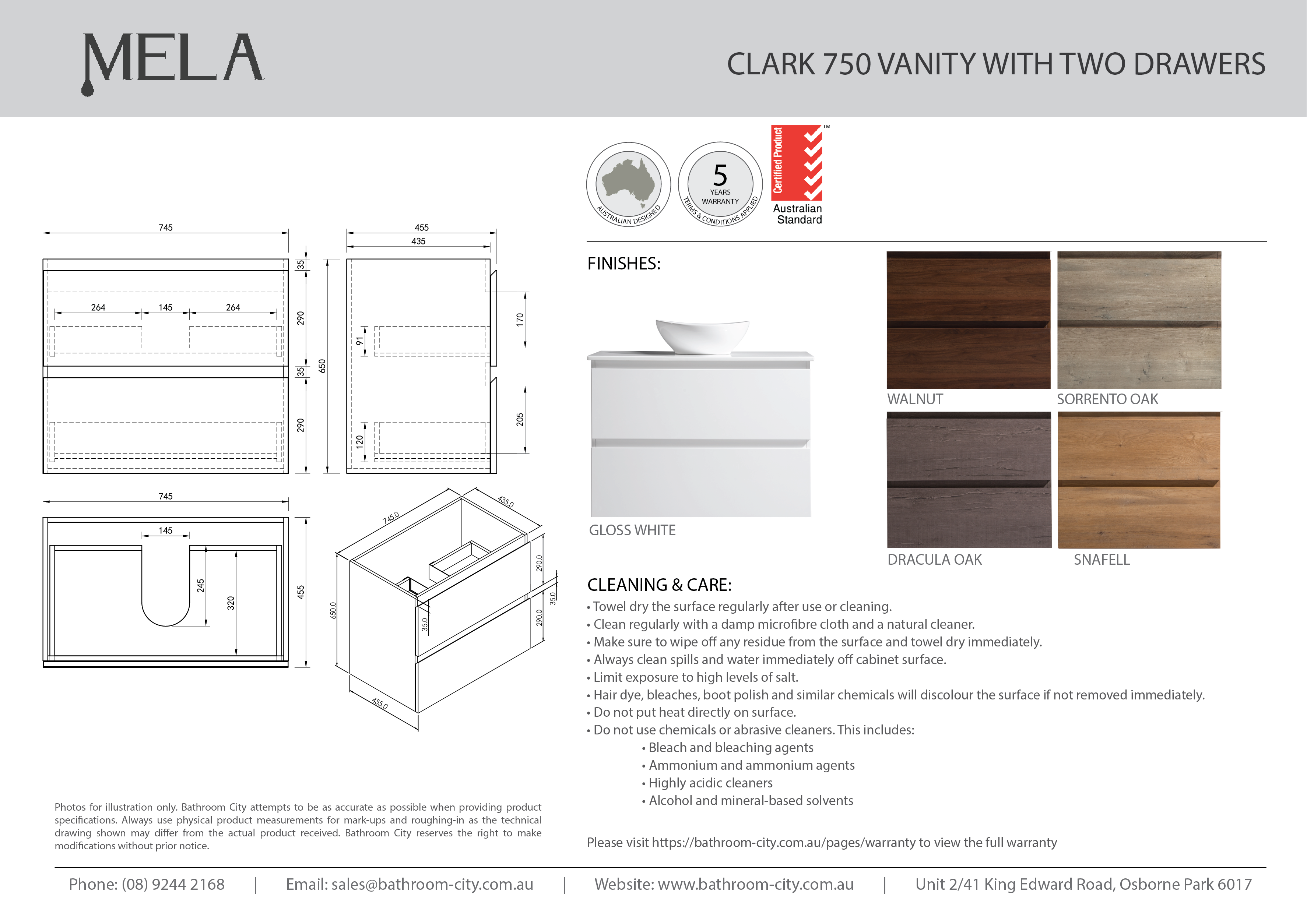 MELA - CLARK 750 Gloss White Wall Hung Vanity with 2 Drawers Package includes the following: