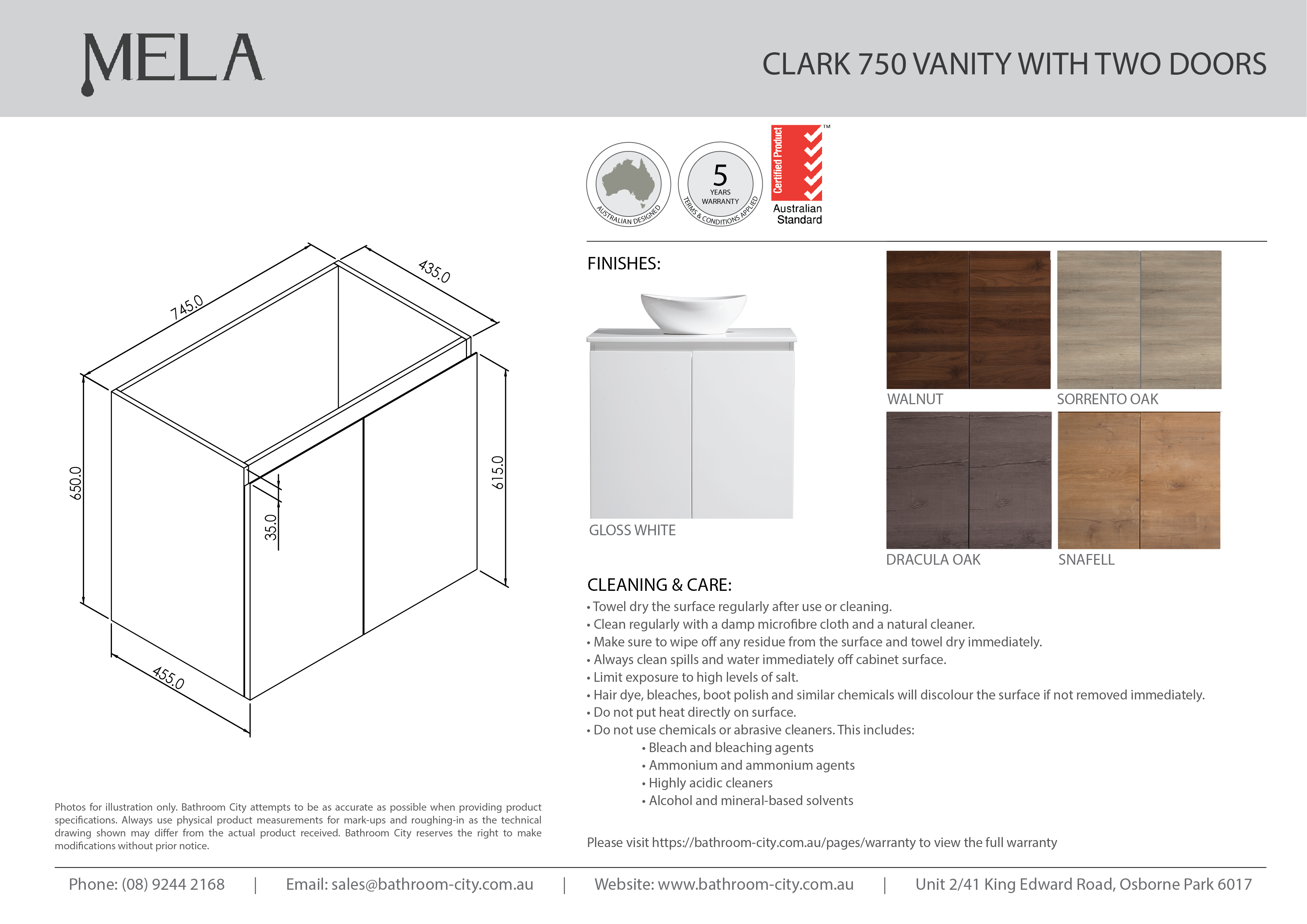 MELA - CLARK 750 Snafell Wall Hung Vanity with 2 Doors