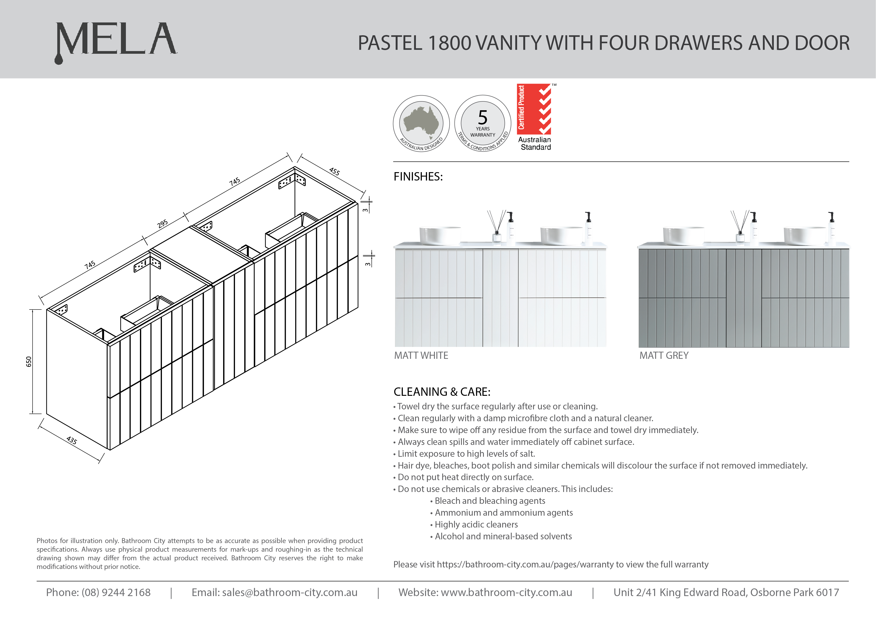 MELA - PASTEL 1800 Matt White Wall Hung Vanity with Door & 4 Drawers Package includes the following: