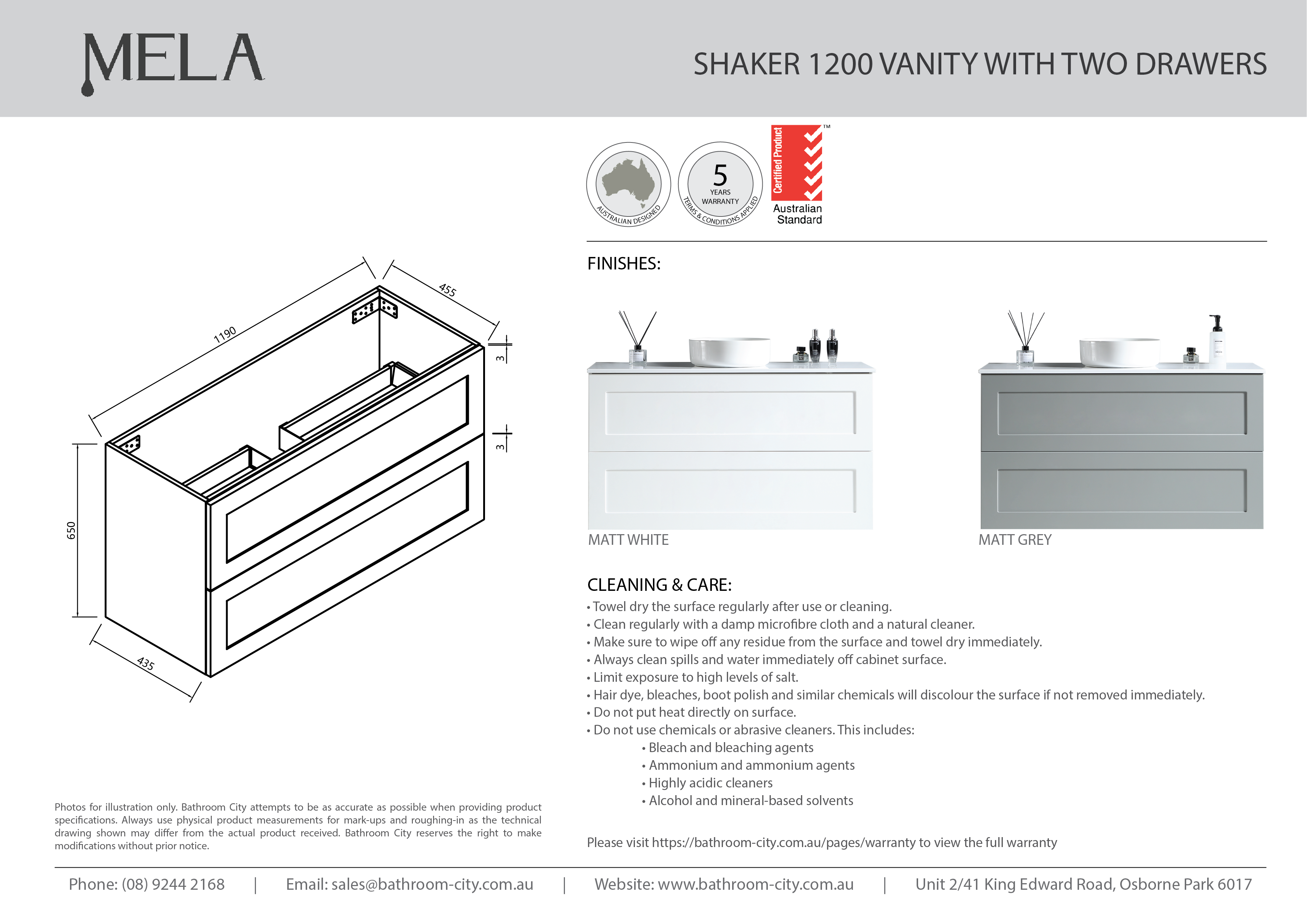 Vanity drawers and cupboards require handles (not included in package price)