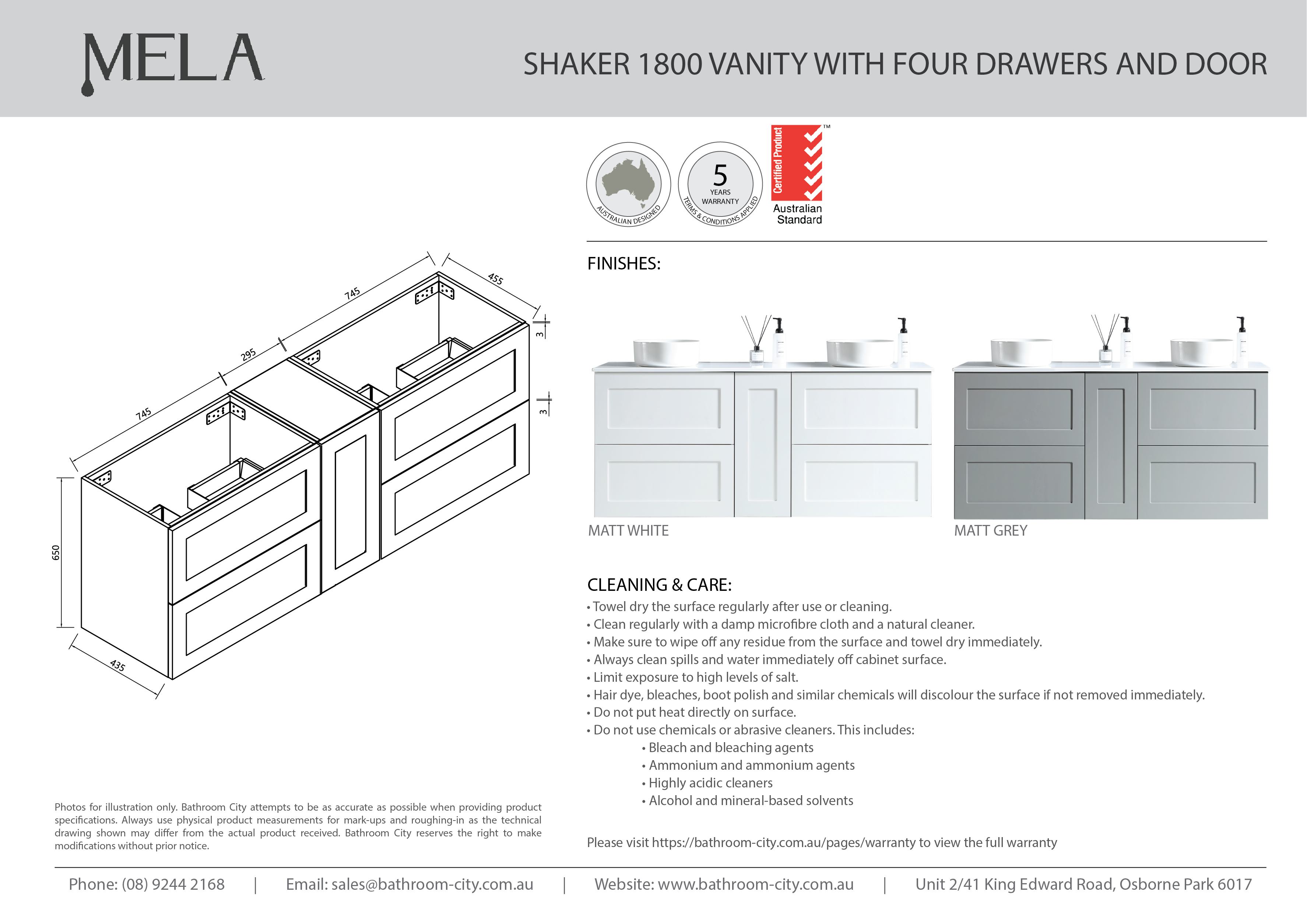MELA - SHAKER 1800 Matt White Wall Hung Vanity with Door & 4 Drawers Package includes the following: