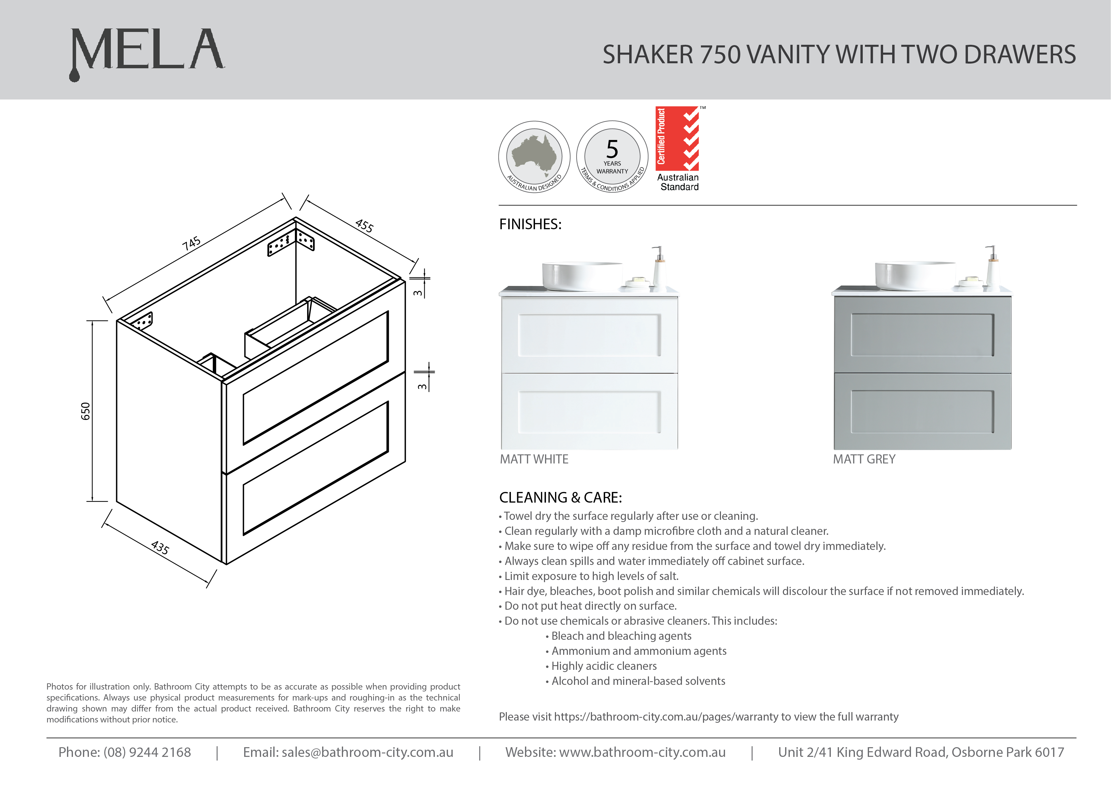 MELA - SHAKER 750 Matt White Wall Hung Vanity with Drawers Package includes the following: