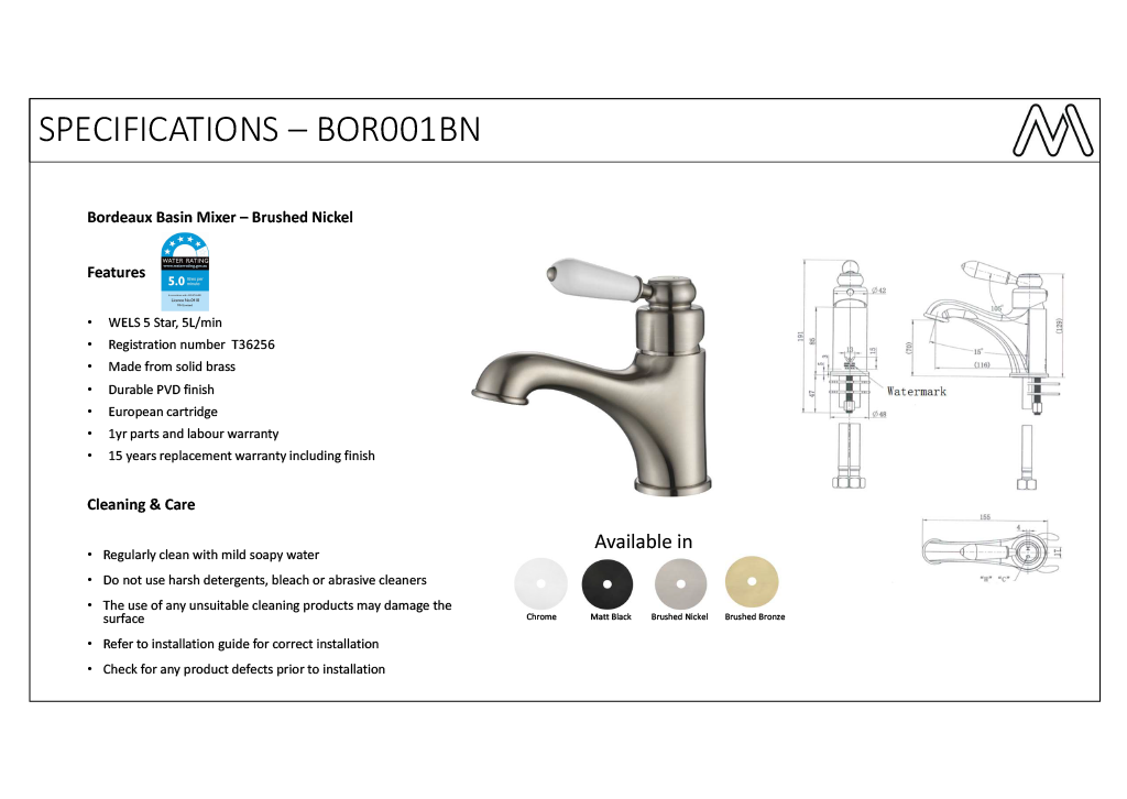 | Model Name | MODERN NATIONAL - BORDEAUX Basin Mixer Brushed Nickel |