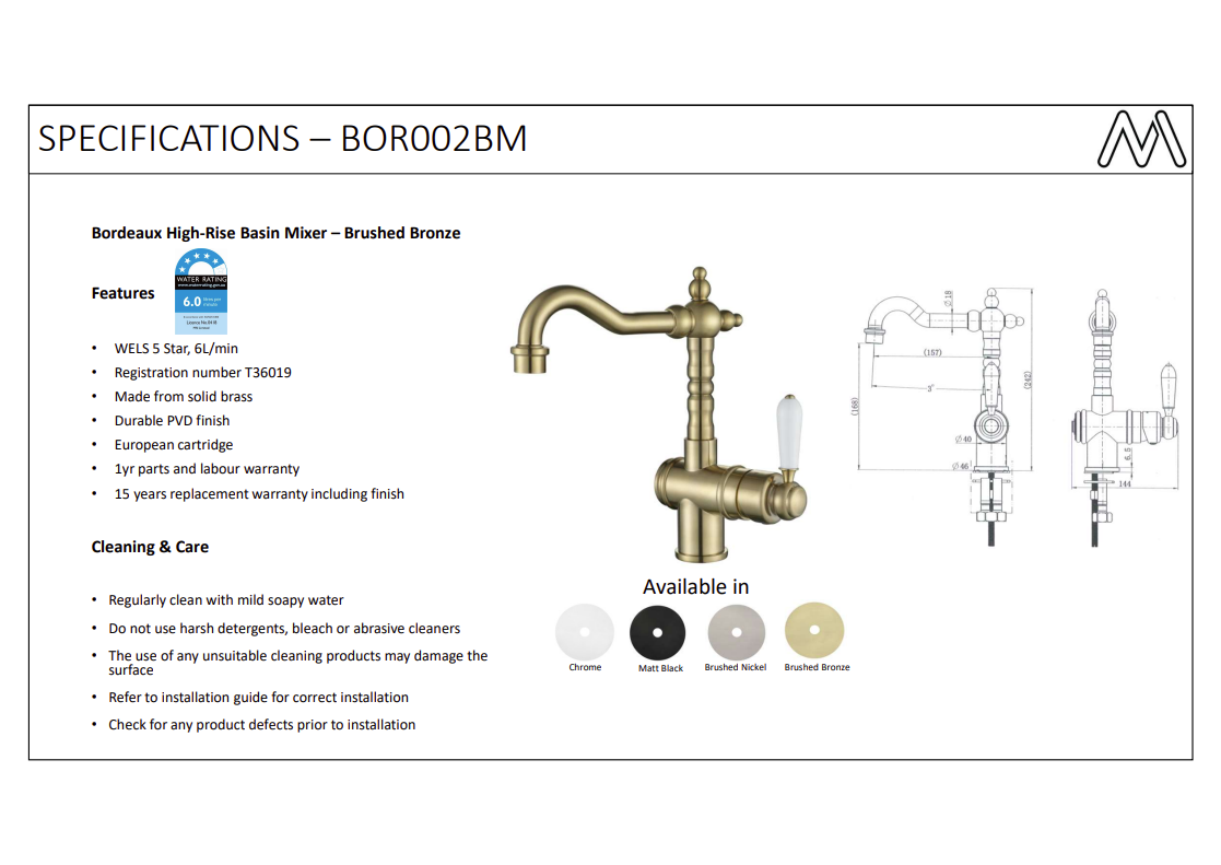 Model Name MODERN NATIONAL- BORDEAUX High Rise Basin Mixer Brushed Bronze
