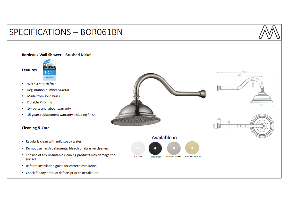 | Model Name | MODERN NATIONAL- BORDEAUX Shower Arm with Shower Head Brushed Nickel |