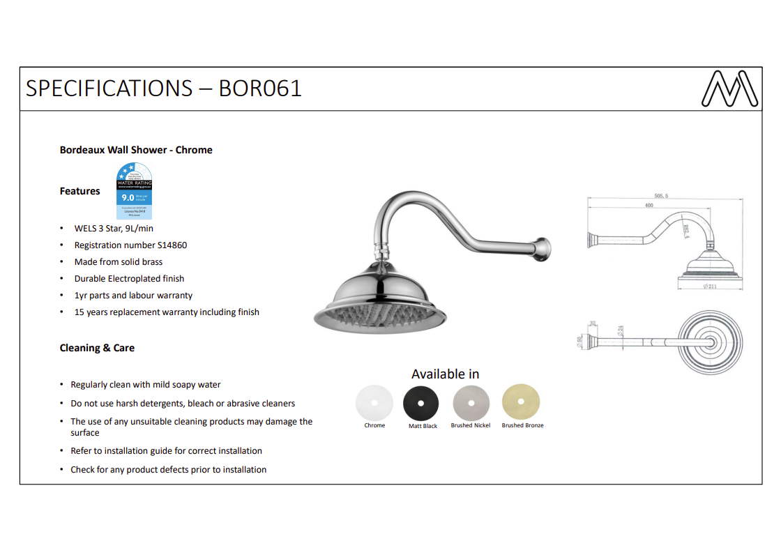 | Model Name | MODERN NATIONAL- BORDEAUX Shower Arm with Shower Head Chrome |