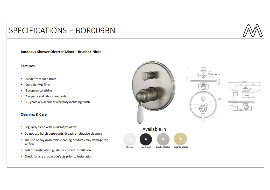 Model Name MODERN NATIONAL- BORDEAUX Shower Mixer with Diverter Brushed Nickel