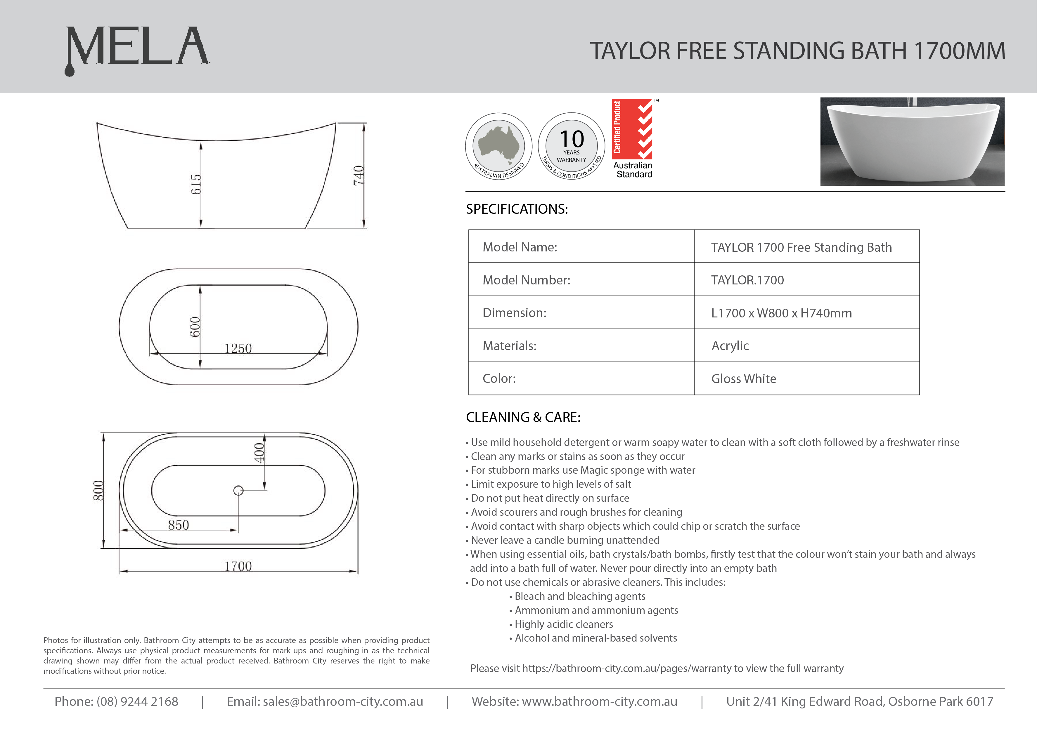 | Model Name | MELA- TAYLOR 1700 High Back Freestanding Bath |