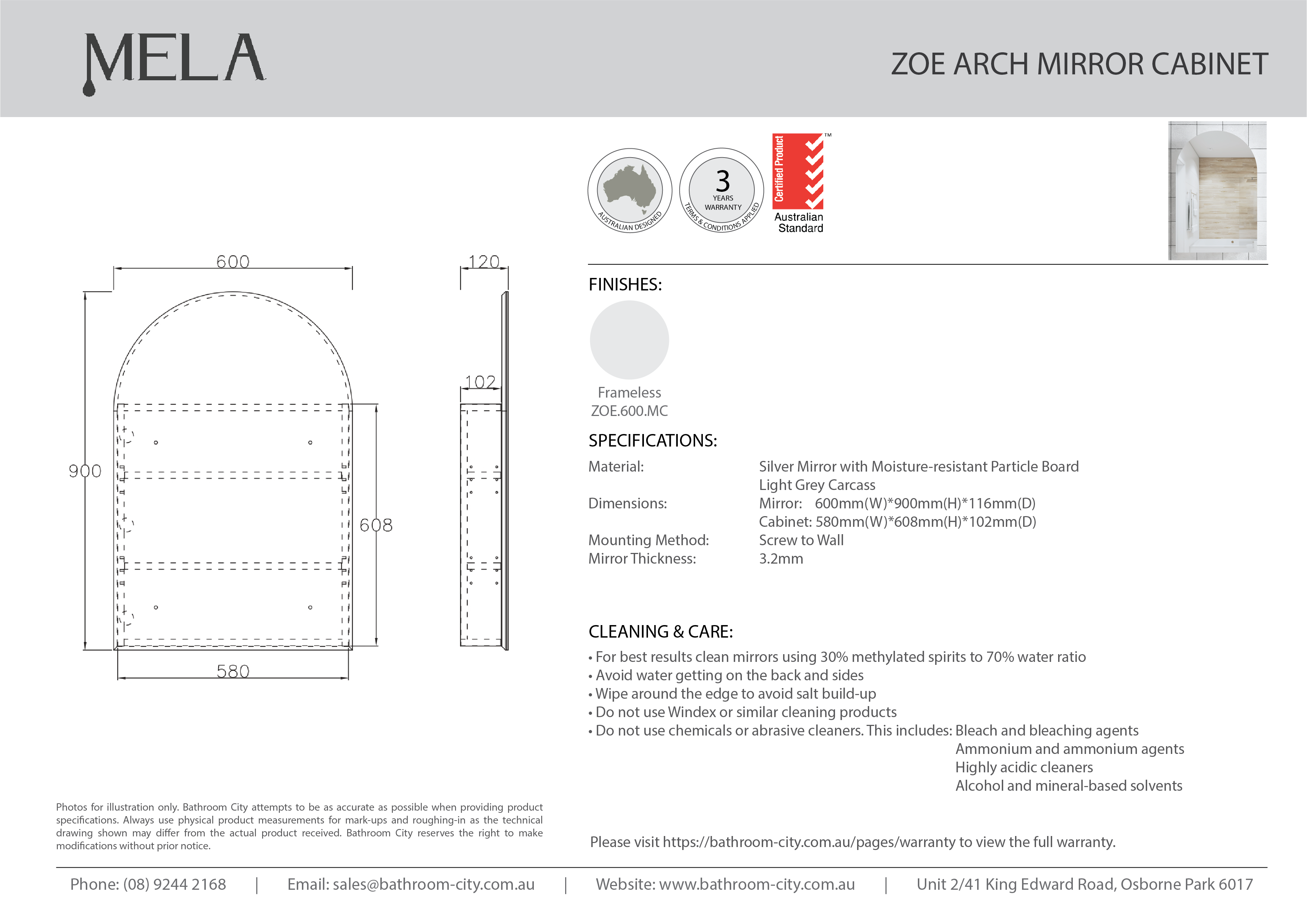 | Model Name | MELA- ZOE 600 Arch Mirror Cabinet |