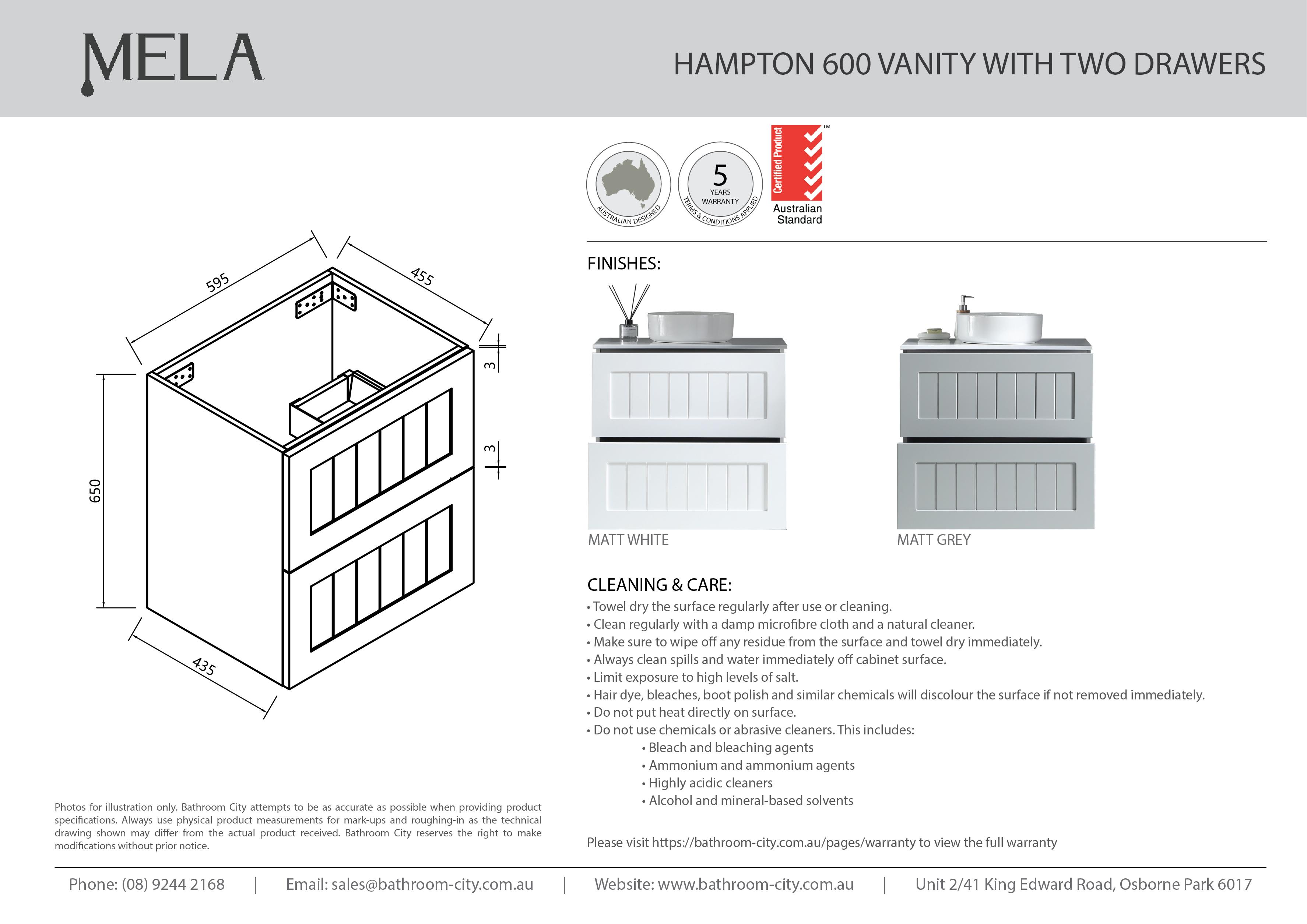 MELA - HAMPTON 600 Matt White Wall Hung Vanity with Drawers Package includes the following: