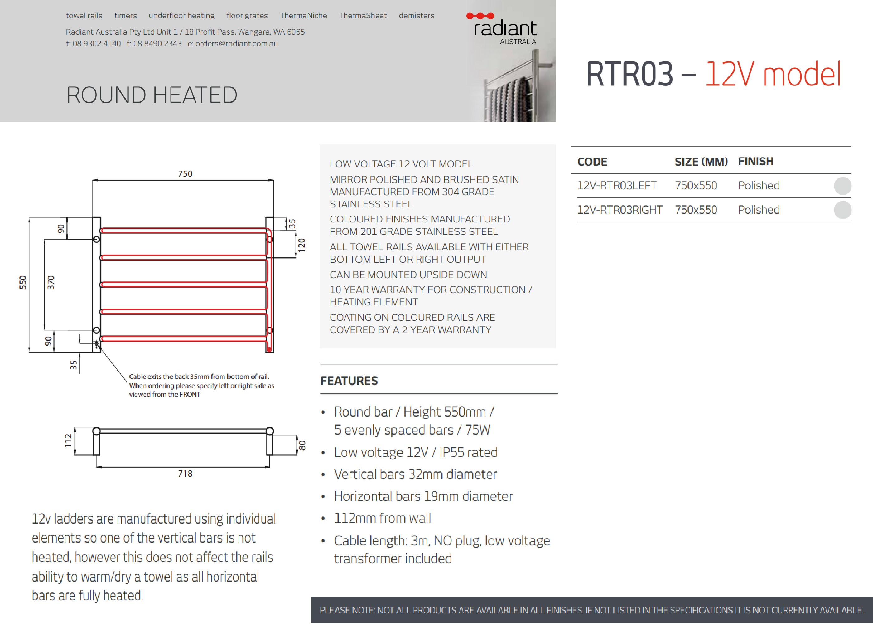 RADIANT - 12V-RTR03 Low Voltage Heated Round Ladder 750x550mm Mirror Polished |
