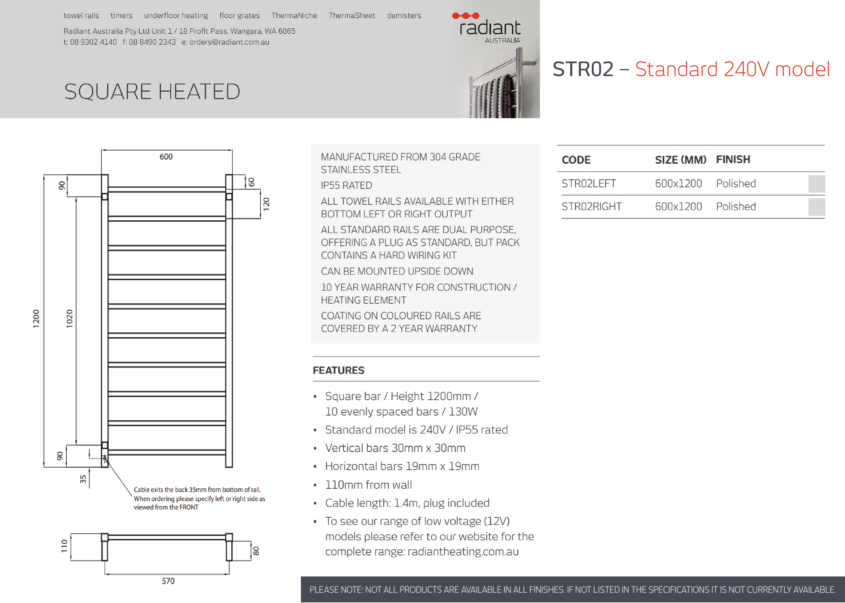 RADIANT - STR02 Heated Square Ladder 600X1200mm Mirror Polished |