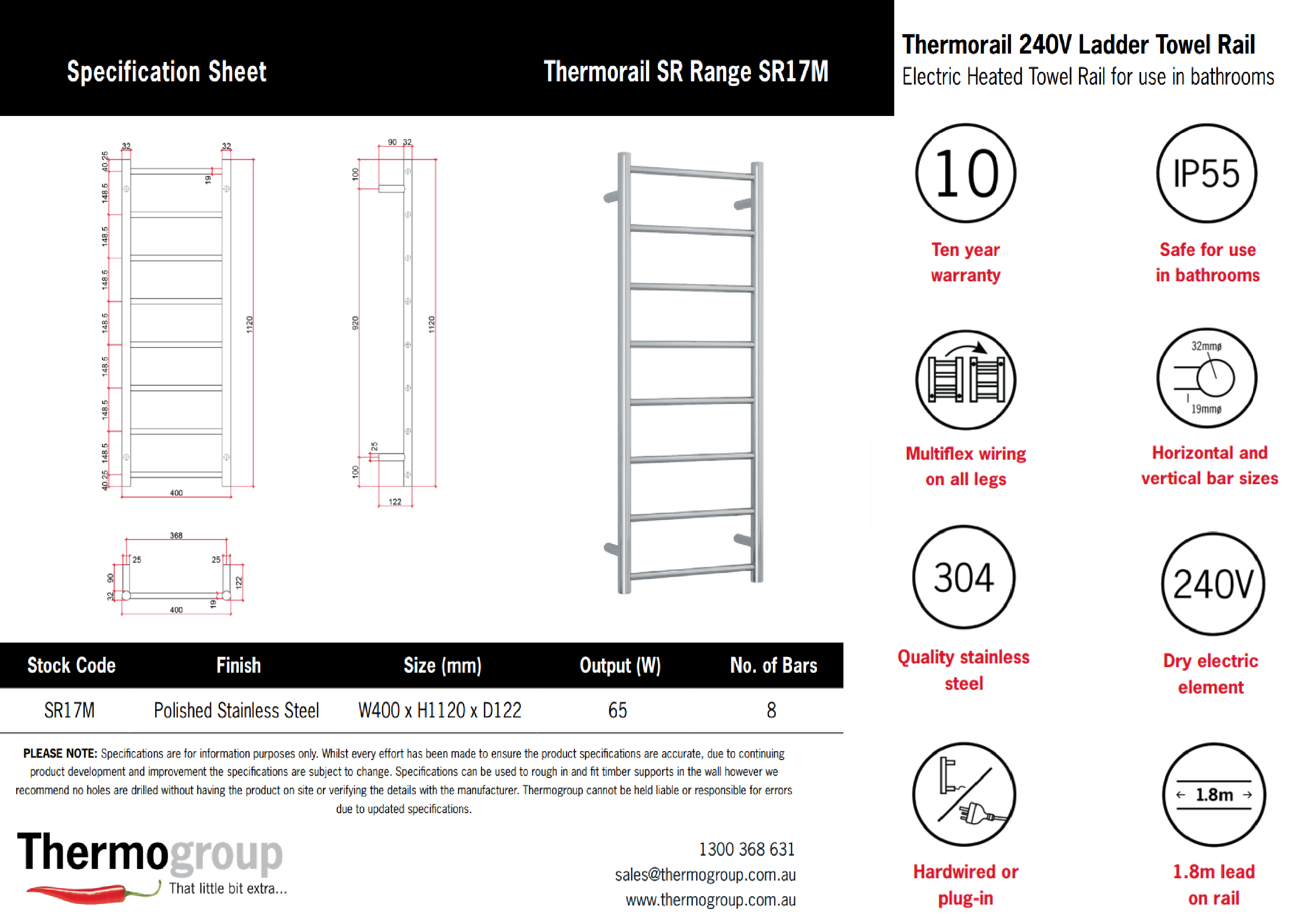 | Model Name | THERMORAIL- SR17M Straight Round Polished Stainless Ladder Heated Towel Rail |