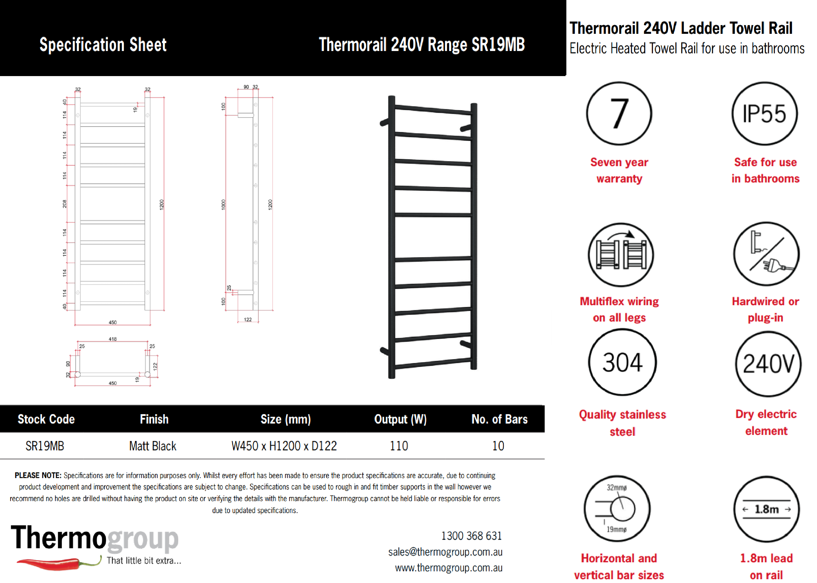 Heated Towel Rails are an affordable luxury for every bathroom for warming and drying your towels. The SR19MB Heated Towel Rail is a 450x1200 10 bar matt black ladder rail which features multiflex wiring. This rail is ideal for being installed in a narrow gap whilst still comfortably accommodating 3 towels. The black finish is of the highest quality to ensure it matches in with your black tapware.