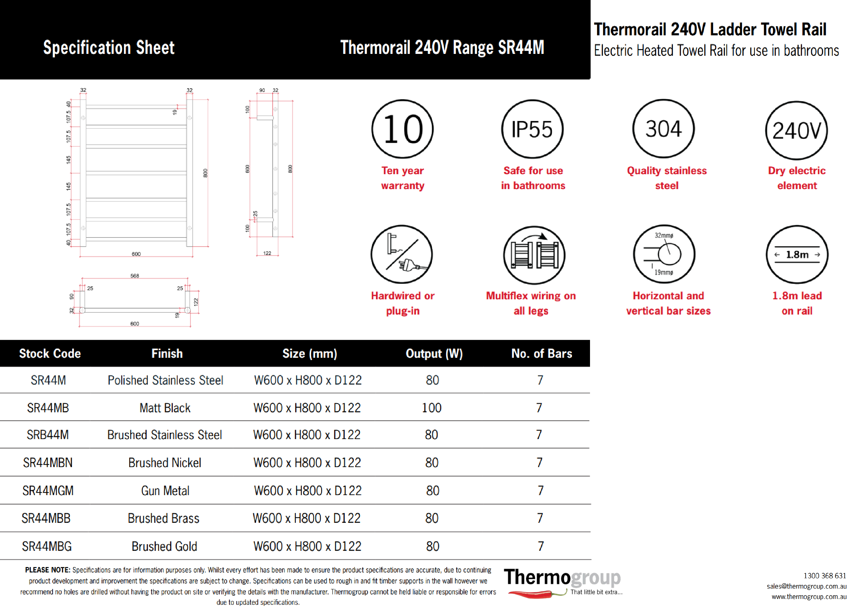 Heated Towel Rails are an affordable luxury for every bathroom for warming and drying your towels. The SR44MBB Heated Towel Rail is a 600x800mm 7 bar Brushed Brass ladder rail which features multiflex wiring. This size of the rail makes it ideal for holding two towels. The Brushed Brass finish is designed to provide a match to your Brushed Brass tapware.