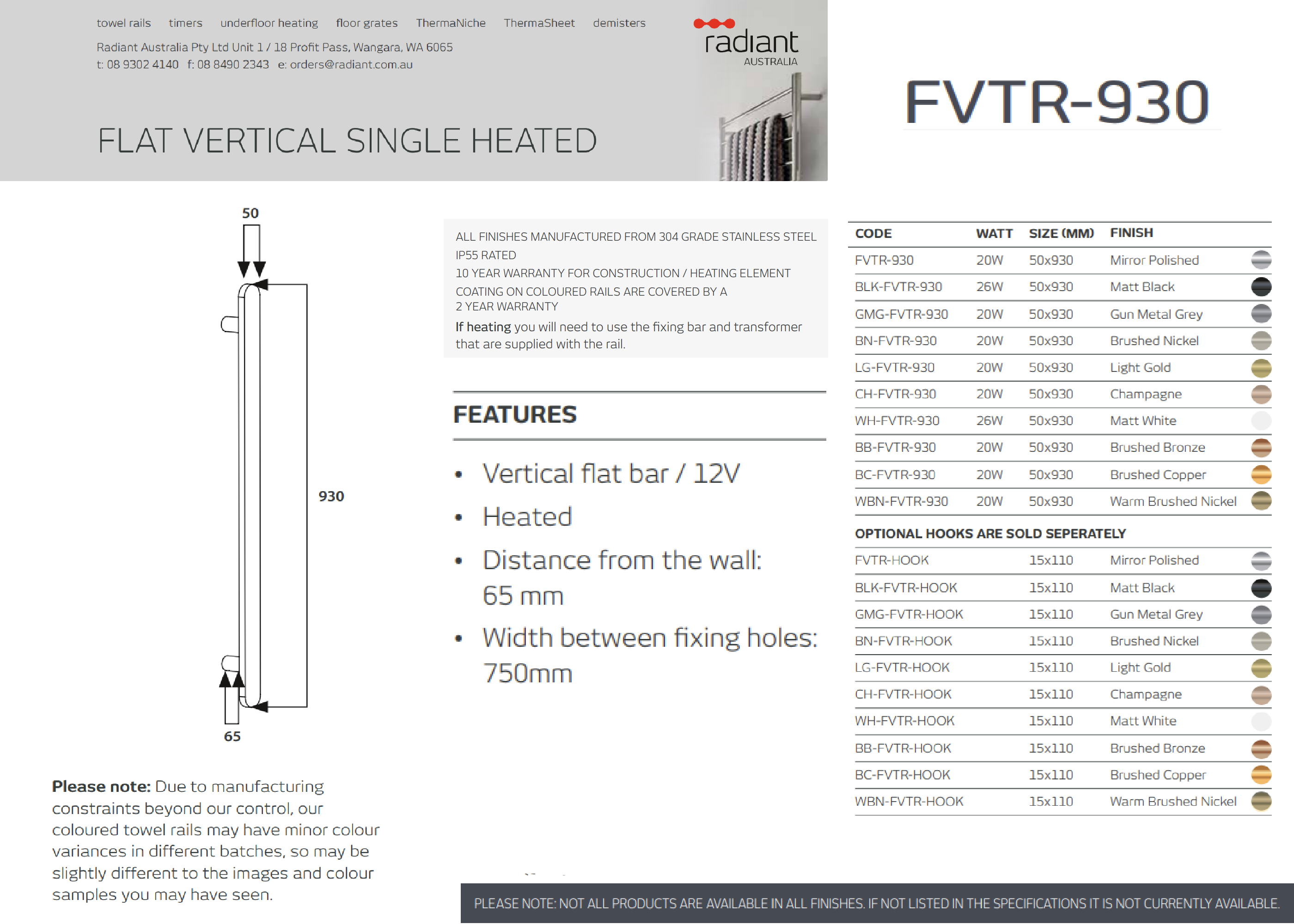 RADIANT - BLK-FVTR-930 Heated Vertical Flat Bar Towel Rail 50x930mm Matt Black