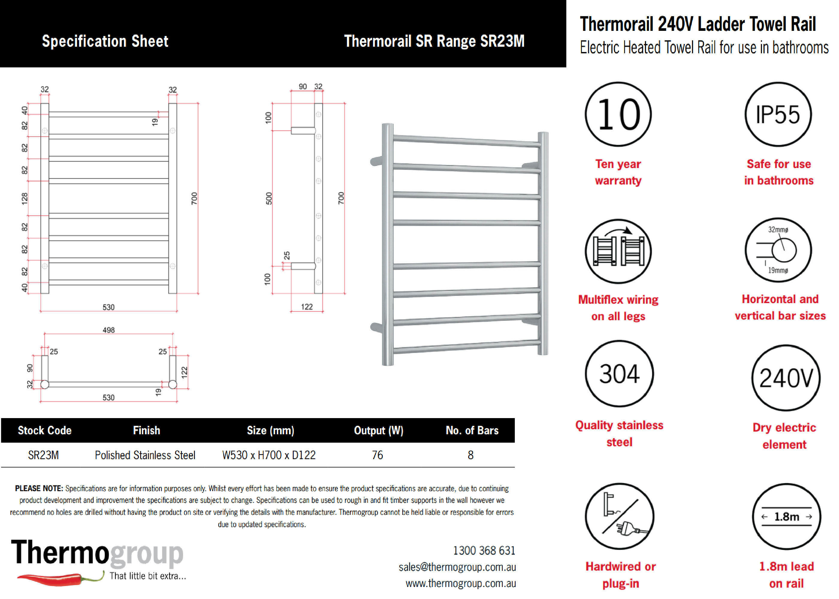 | Model Name | THERMORAIL- SR23M Straight Round Polished Ladder Heated Towel Rail |