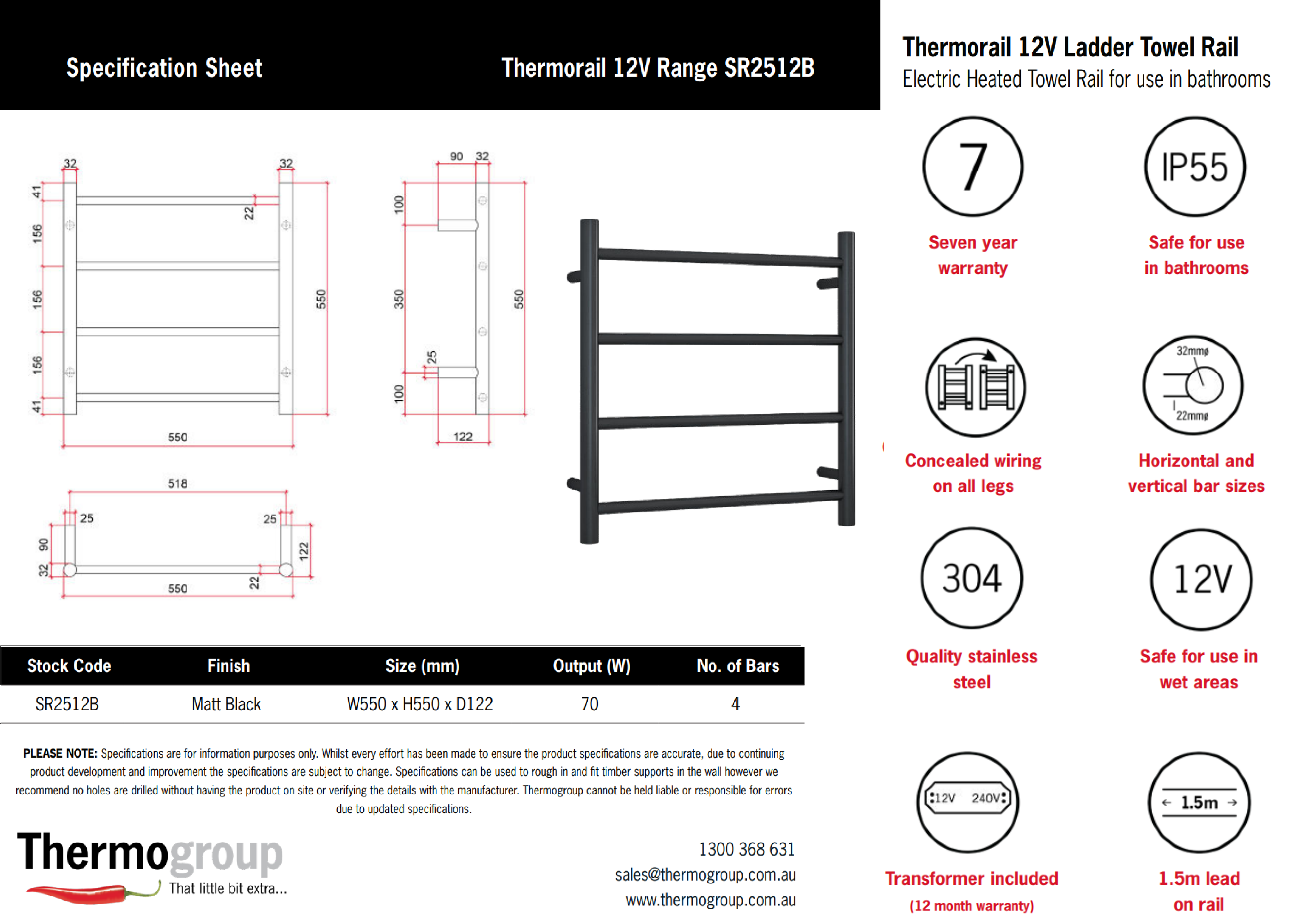 | Model Name | THERMORAIL - SR2512B 12Volt Matt Black Round Ladder Heated Towel Rail |